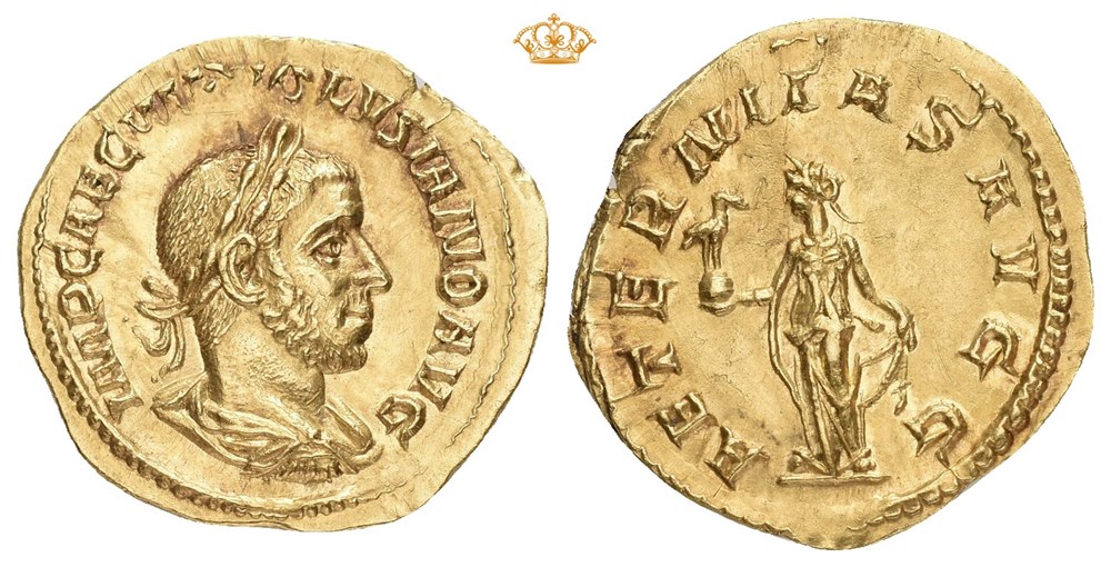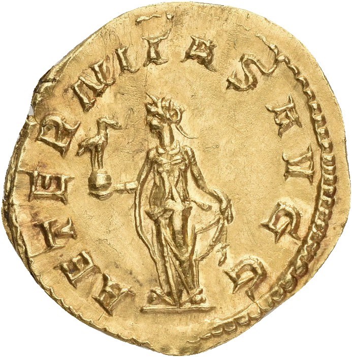 Volusian, AD 251-253. AV aureus (21.0 mm, 3.89 g). Rome mint, struck AD 251-253. Laureate, draped and cuirassed bust right / Aeternitas standing left, holding Phoenix on globe in right hand and lifting up hem of skirt with left. Lightly brushed and with a tiny edge mark. Extremely rare