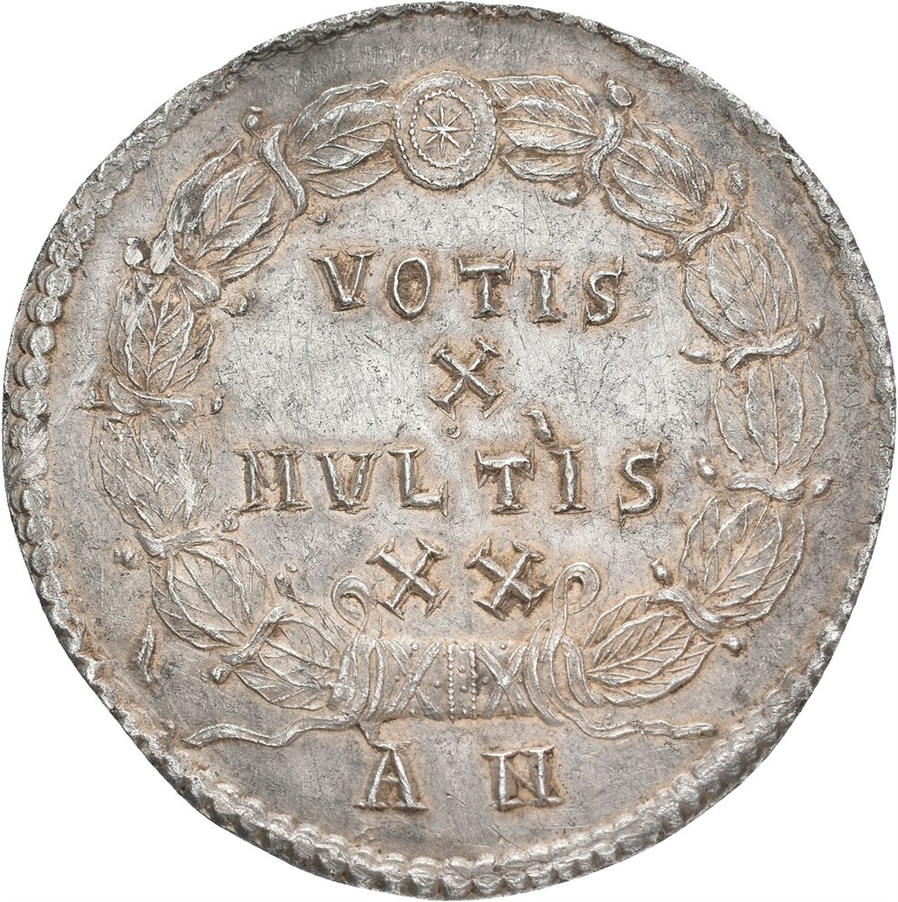 Valentinian I, AD 364-375. AR medallion of 48 siliqua (67.0 mm, 103.70 g). Antioch mint, struck AD 369. Diademed, draped and cuirassed bust of Valentinian right / VOT/X/MVLTIS/XX within laurel wreath; mintmark AN (Antioch) in exergue. Small scrape on reverse and a few shallow scratches and areas of light corrosion in fields. Steel-grey toning with light golden hues on reverse. Apparently unique and unpublished. This medallion was previously sold with certificates of authenticity from David R. Sear and Frank L. Kovacs, see description from the Goldberg sale in 2009