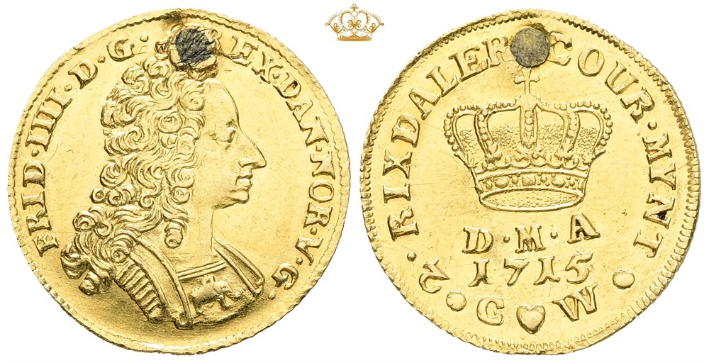 Kurantdukat / 2 rixdaler 1715 (2.87 g). København. Uvanlig årstall / rare date. Plugget / plugged