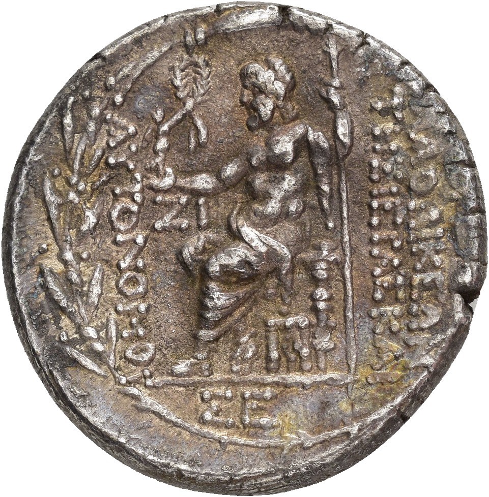 SELEUKIS & PIERIA, Laodikeia. 78/7-16/5 BC. AR tetradrachm (27.5 mm, 15.13 g). Dated CY 17 (=65/4 BC). Veiled, draped, and turreted bust of Tyche right / ΛΑΟΔΙΚΕΩΝ / ΤΗΣ ΙΕΡΑΣ ΚΑΙ / ΑΥΤΟΝΟΜΟV, Zeus Nikephoros seated left, holding Nike with wreath in outstretched right hand and resting on grounded scepter with left; ZI (date) to inner left; monogram below throne, ΣE in exergue; all within wreath. Light porosity in fields. Deep iridescent toning