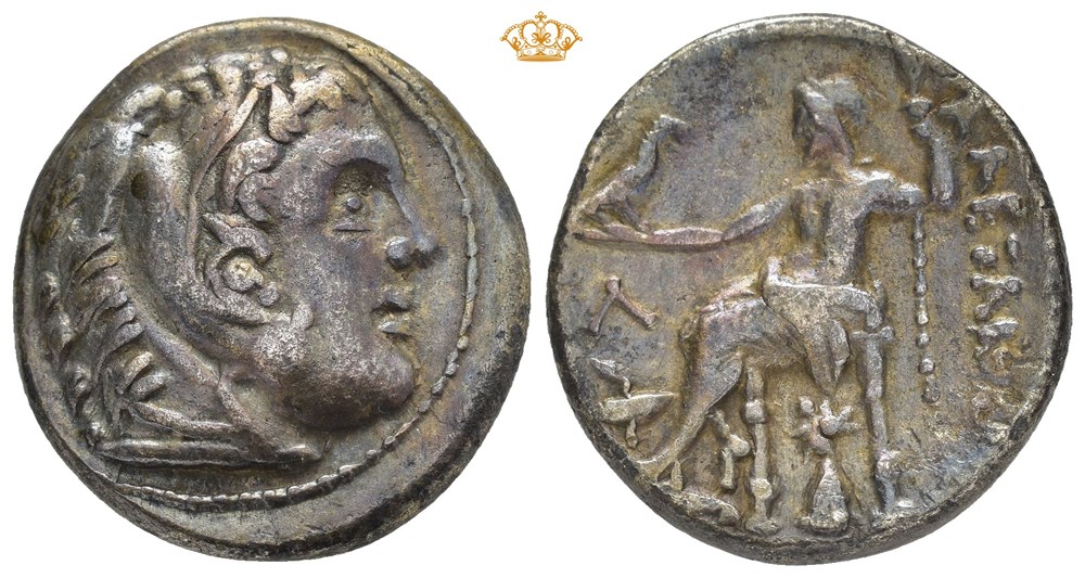 KINGS of MACEDON. Kassander. As regent, 317-305 BC, or king, 305-298 BC. AR tetradrachm (26.5 mm, 15.37 g). In the name and types of Alexander III. Amphipolis mint, struck circa 307-297 BC. Head of Herakles right, wearing lion skin headdress / AΛEΞANΔPOY, Zeus Aëtophoros seated left; in left field, monogram above torch; star on cone below throne. Deep iridescent cabinet toning