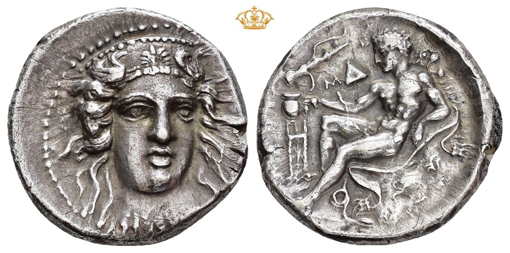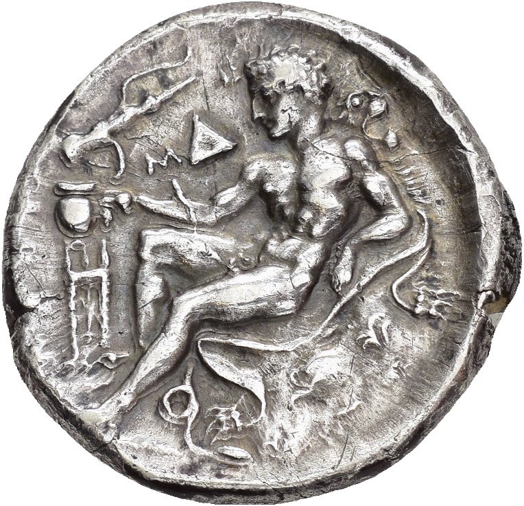BRUTTIUM, Kroton. Circa 400-325 BC. AR nomos (21.0 mm, 7.63 g). Head of Hera Lakinia facing slightly right, wearing necklace and decorated stephanos; [Δ to right] / KPOT[Ω], Herakles Epitrapezios, nude and reclined towards left, holding cup in extended right hand and lying on skin draped over rock; in upper field: crossed bow and club above MΔ; tripod in left field. A little off-center. Attractively toned
