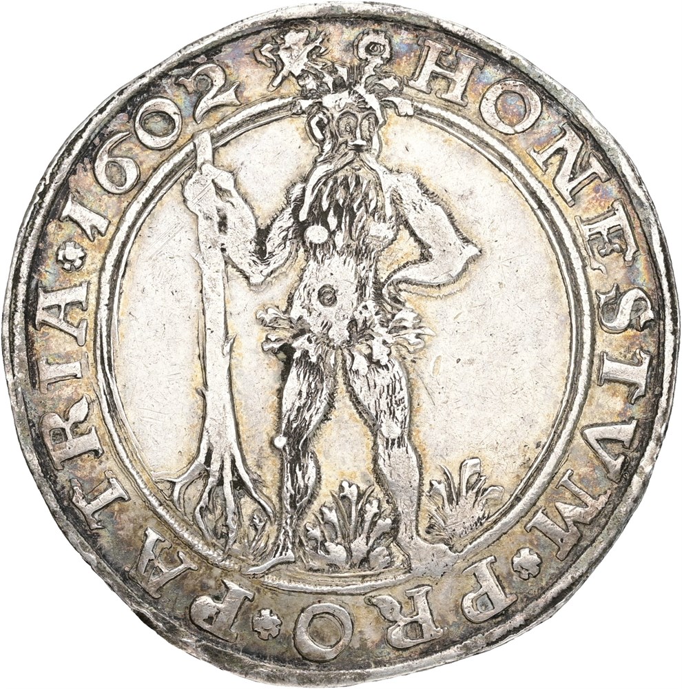 Taler 1602. Zellerfeld mint. Some remaining mint luster in fields. Iridescent toning around devices