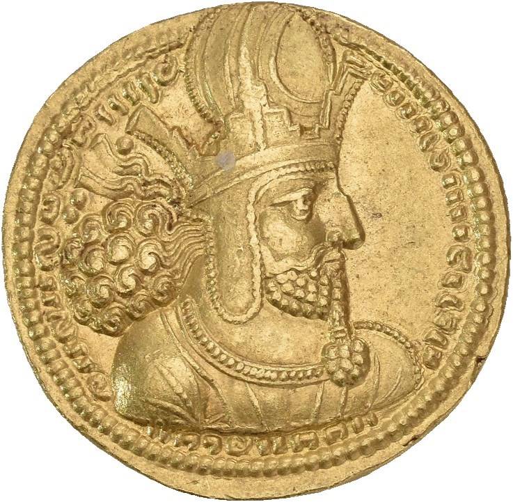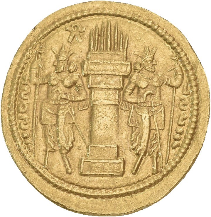 SASANIAN KINGS. Shahpur I, AD 240-272. AV dinar (22.0 mm, 7.34 g). Ctesiphon mint, circa AD 260-272. mzdysn bgy šhpwhry MRK’n MRK’ ’yr’n MNW ctry MN yzd’n in Pahlavi, Diademed bust right, wearing mural crown with korymbos; pellets in field to left / nwr’zy in Pahlavi to right, šhpwhry in Pahlavi to left; fire altar flanked by two attendants; fravahr to left of flames. A clear and attractive specimen