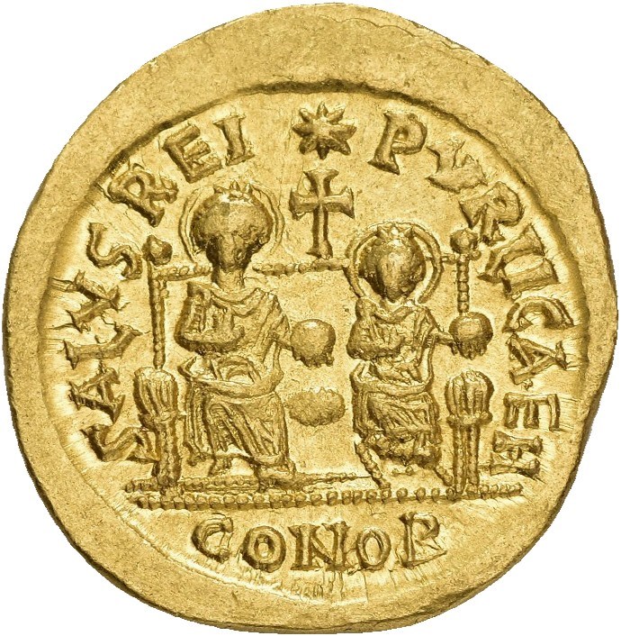 Basiliscus and Marcus, AD 475-476. AV solidus (20.0 mm, 4.45 g). Constantinople mint, struck AD 457-476. Pearl-diademed, helmeted and cuirassed bust facing, holding spear over shoulder and shield decorated with horseman spearing fallen foe / Basiliscus and Marcus seated facing on double throne, each nimbate, both holding mappa and globus; in upper field between them, cross above star; CONOB in exergue. A clear and attractive coin with traces of mint luster in the recesses