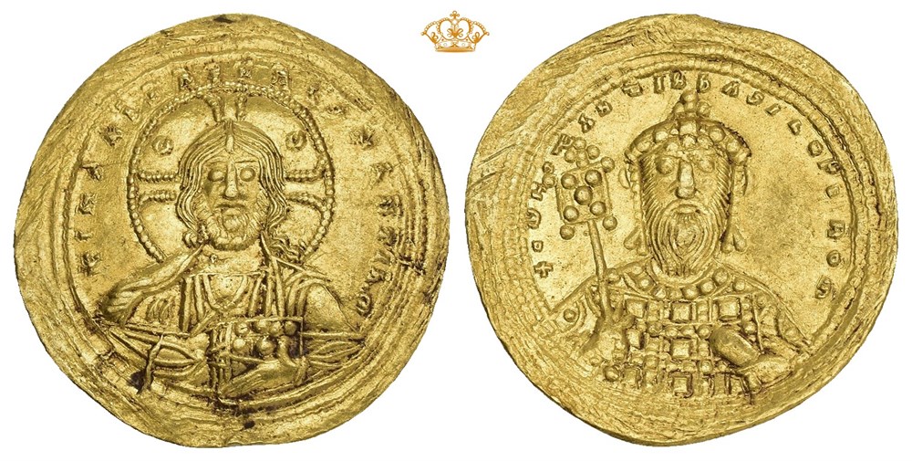 Constantine VIII, AD 1025-1028. AV histamenon nomisma (25.5 mm, 4.41 g). Constantinople mint. Facing nimbate bust of Christ Pantokrator, raising hand in benediction and holding Gospels; crescents in upper two quarters of nimbus / Crowned facing bust of Constantine, wearing jeweled loros, holding labarum and akakia. A clear and attractive specimen with a few traces of earthen deposits on obverse