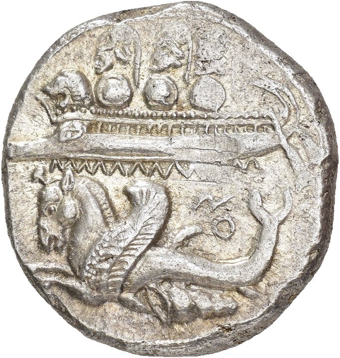 PHOENICIA, Byblos (Gebal). 'Ozba'al, circa 400-365 BC. AR shekel (23.5 mm, 13.11 g). Three hoplites, holding shields, standing left on galley, prow ending ornate with lion's head; below, hippocamp swimming left above murex shell; 'Z (= Oz[baal], in Phoenician) above dorsal fin / Lion attacking bull left; ['ZB'L ML]K GBL (= Ozbaal, king of Gebal, in Phoenician) above. Some areas of weak strike. Lightly toned