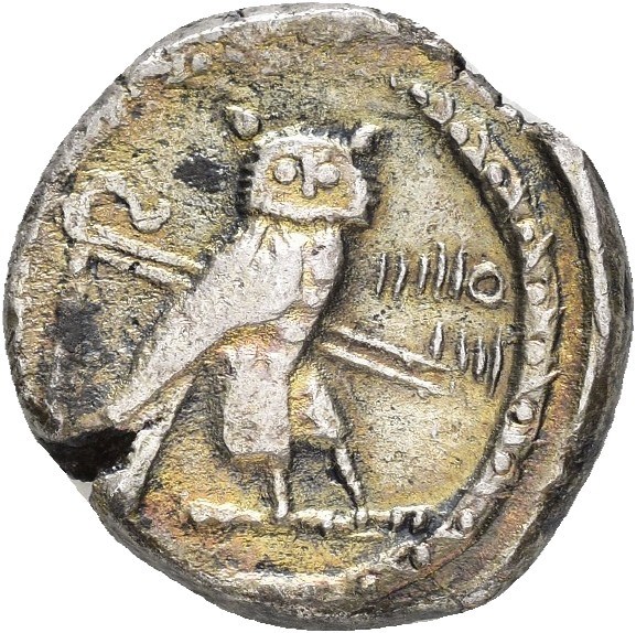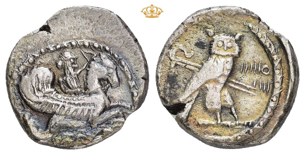 PHOENICIA, Tyre. 'Ozmilk (Azemilkos, circa 349-311/0 BC. AR shekel (19.5 mm, 8.32 g). Attic standard. Dated RY 9 (=341/0 BC). Bearded male deity, holding reins and bow, riding hippocamp right above two series of waves; below, [dolphin swimming right] / Owl standing right, head facing; crook and flail in background; IIIII O above IIII (' [for 'Ozmilk] and 9 [date], in Phoenician) in right field. Flan cracks and struck a little off-center. Iridescent toning