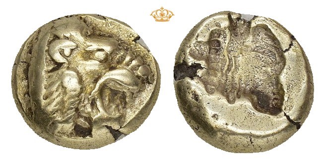 LESBOS, Mytilene. Circa 521-478 BC. EL hekte - 1/6 stater (10.0 mm, 2.52 g). Head of roaring lion right / Incuse head of a calf right. Small flan cracks and traces of deposits. Clear and attractive