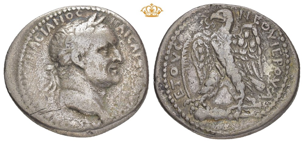 SELEUCIS and PIERIA, Antioch. Vespasian, AD 69-79. AR tetradrachm (30.0 mm, 14.19 g). Dated NHY 2 (=AD 69). Laureate head right / Eagle with spread wings standing left on club, holding wreath in beak; palm frond to left; A (date) in legend. Struck on a very broad flan. Some porosity in fields and a few old scratches on obverse. Attractive cabinet toning
