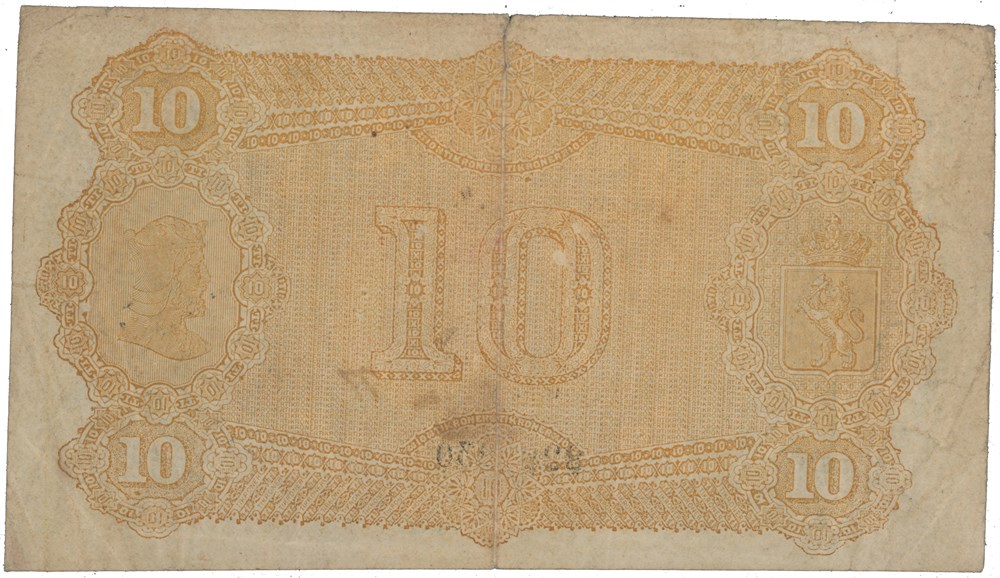 10 kroner 1877. 2293231. Signert Meier. Brettrift oppe/fold tear.