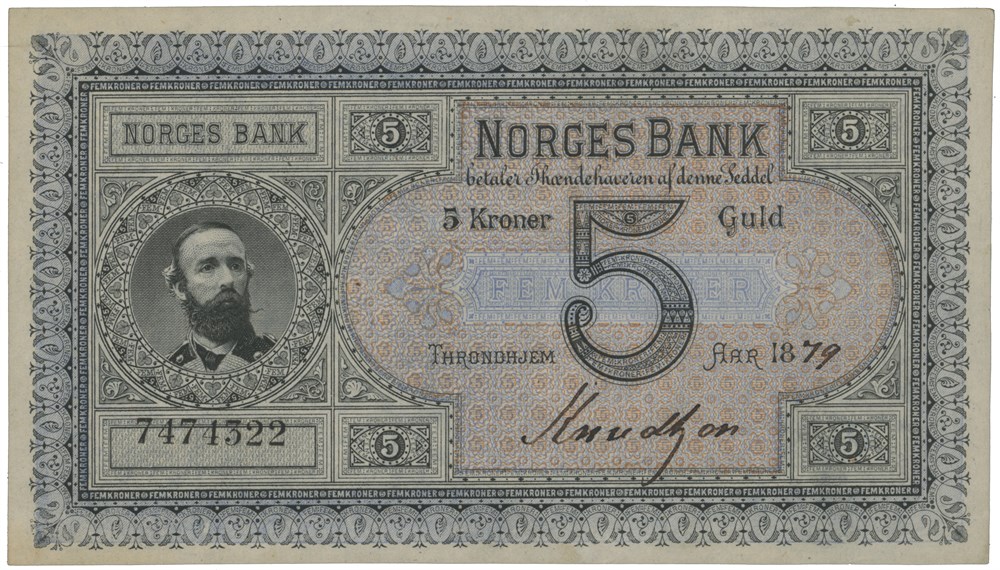 5 kroner 1879. 7474322. Signert Knudtzon. Sjelden/rare.