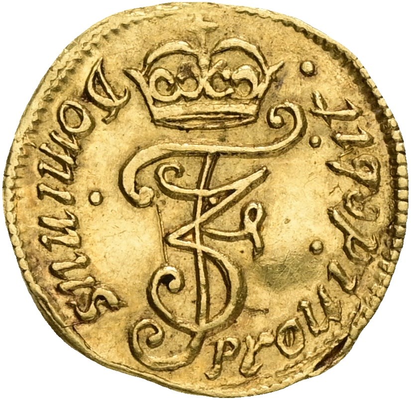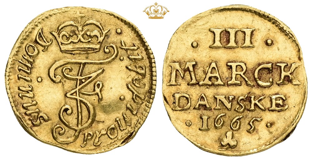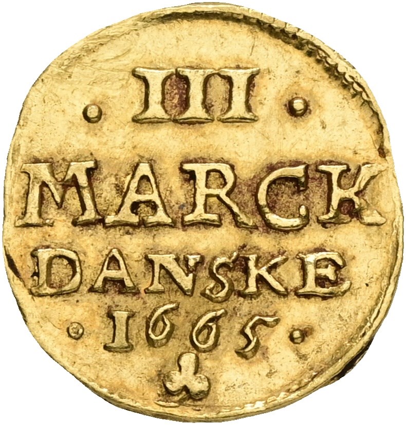 1/4 dukat / III mark 1665 (0,87 g). København. Lett buklet og ripe øverst i venstre reversfelt. Av største sjeldenhet, og kun to kjente eksemplarer / Excessively rare and one of only 2 specimens known