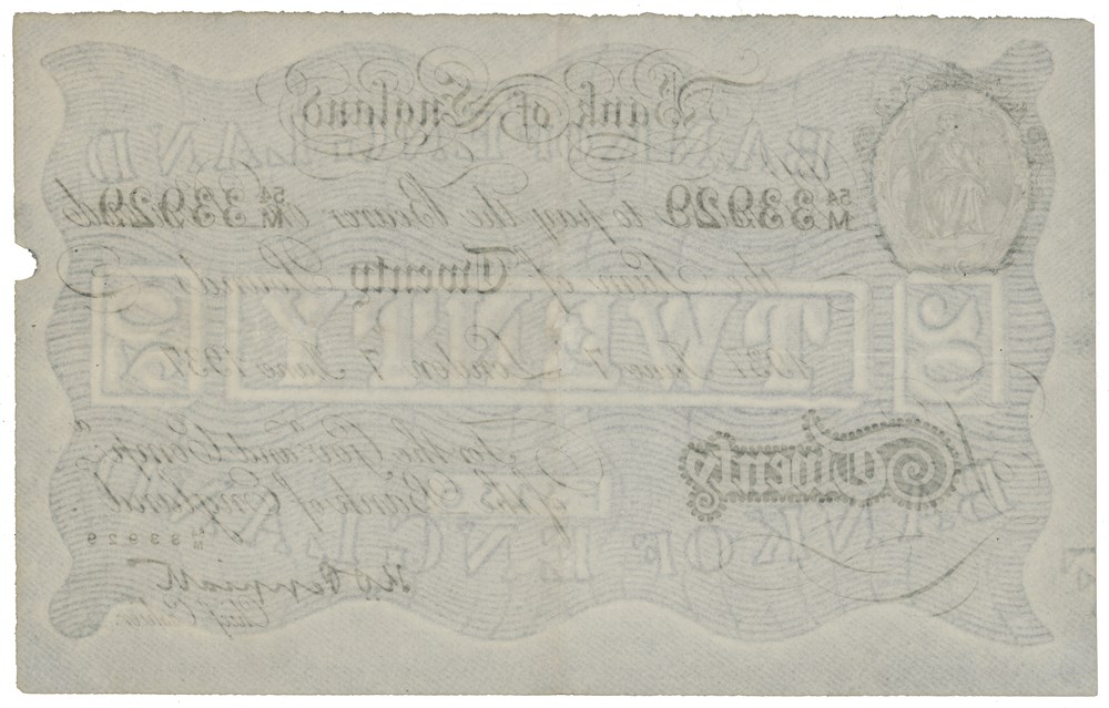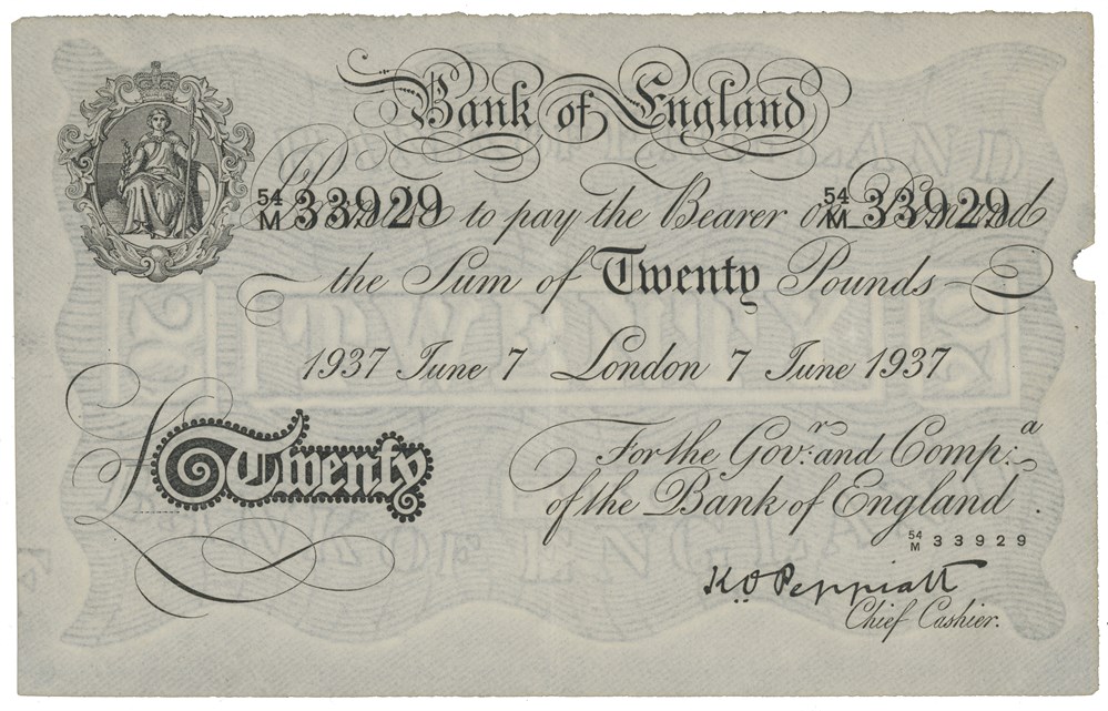 20 pounds London 7.6.1937. No. 54/M 33929. Operation Bernhard counterfeit. Paper maker's notch and small pinholes.