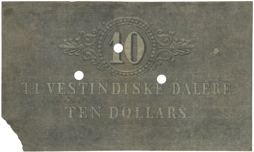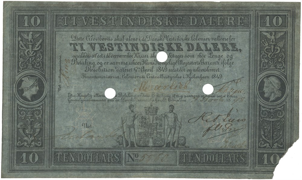 10 vestindiske dalere 1849. No. 5560. Put into circulation 3.11.1898, rare date. Hole cancelled and missing corner.