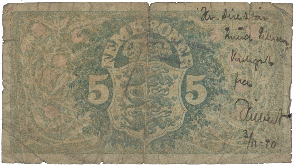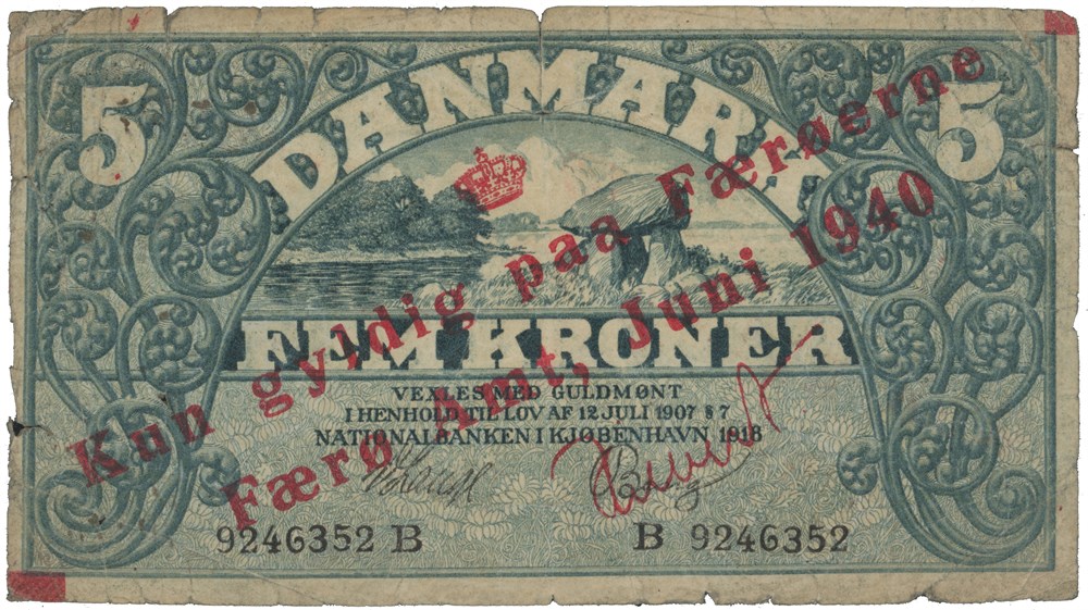 5 kroner 1918. No. B 9246352. Signed V. Lange/Bang, overprinted "Kun gyldig paa Færøerne, Færø Amt, Juni 1940". Ink writing on reverse and tears. Extremely rare, no overprinted banknotes from the Heilmann I-series (1912-29) are noted in Sieg.