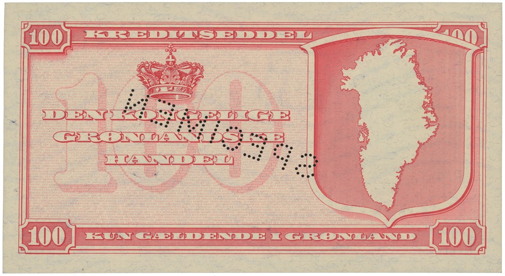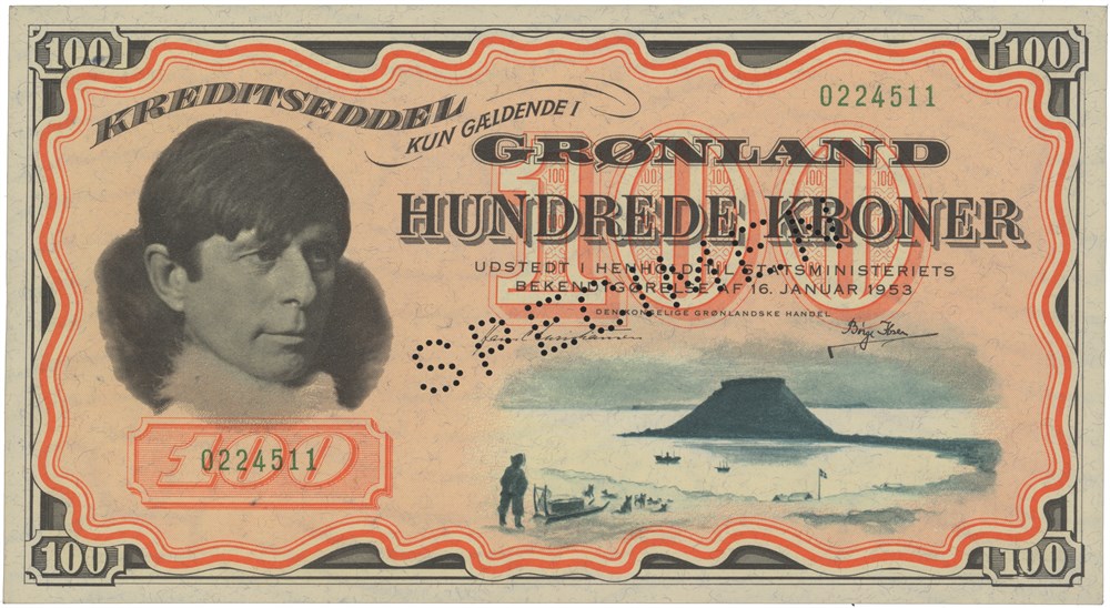 - 100 kroner ND (1953). No. 0224511. Perforated SPECIMEN. (14888246)