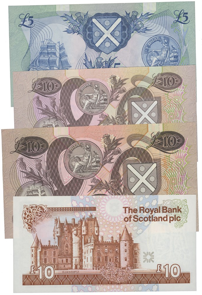 Lot 4 pcs. 5 pounds 1984, 10 pounds 1990, 1992 (Bank of Scotland) and 10 pounds 1994 (The Royal Bank of Scotland).