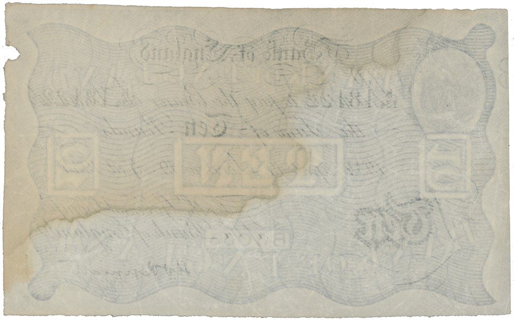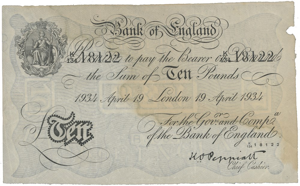 10 pounds London 19.4.1934. No. K/134 18122. Operation Bernhard counterfeit. Stained, paper maker's notch.