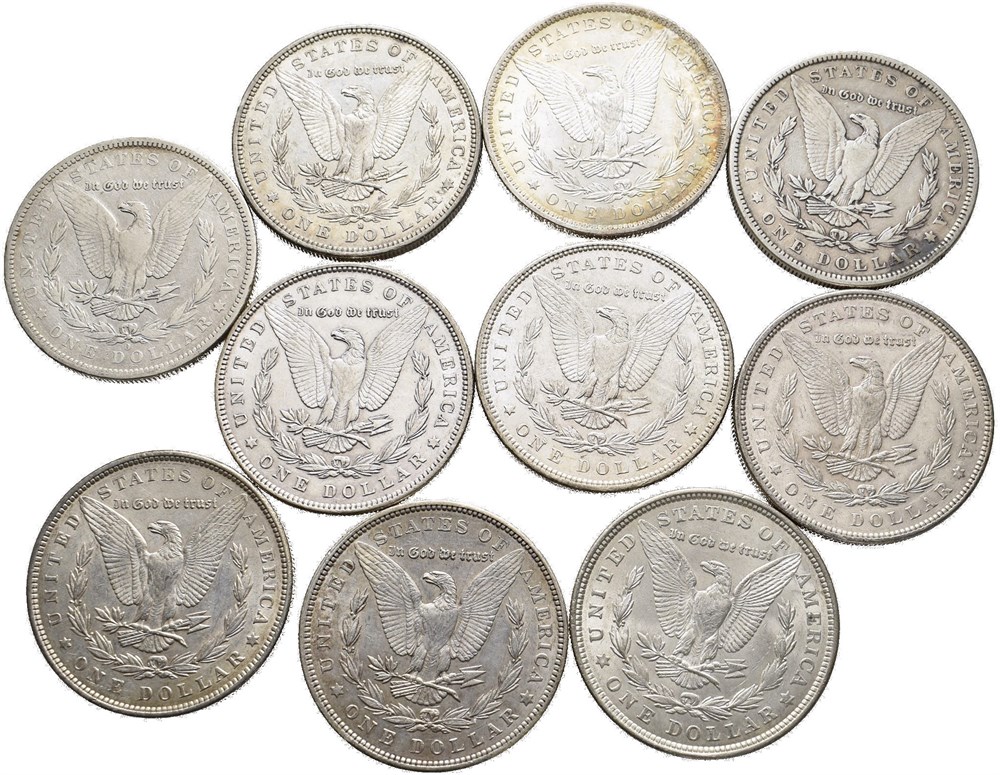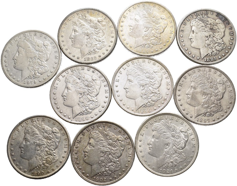 - Lot 10 stk. 1 dollar Morgan type; 1879 O, 1882 S, 1884 O, 1885, 1890, 1896 (2), 1897, 1902 og 1921 (15013183)