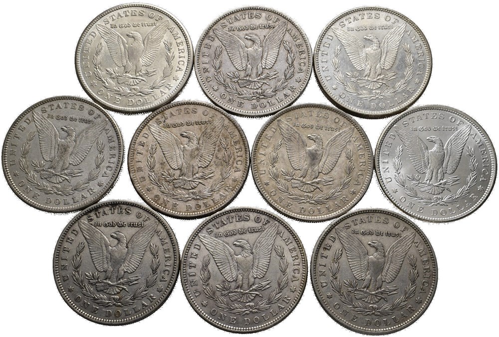 - Lot 10 stk. 1 dollar Morgan type; 1879, 1884, 1886, 1889, 1890, 1891, 1896 (2), 1897 O og 1921 S (15013219)