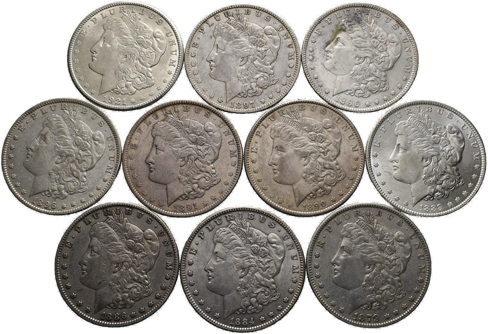 Lot 10 stk. 1 dollar Morgan type; 1879, 1884, 1886, 1889, 1890, 1891, 1896 (2), 1897 O og 1921 S