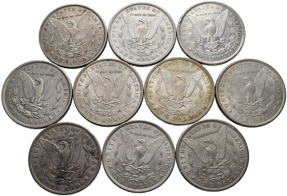 - Lot 10 stk. 1 dollar Morgan type; 1879, 1880 S, 1881 O, 1882, 1884 O, 1890, 1891, 1896 (2) og 1897 O (15013255)
