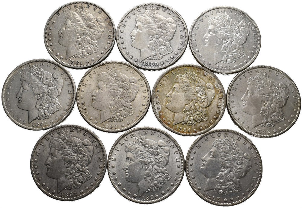 Lot 10 stk. 1 dollar Morgan type; 1879, 1880 S, 1881 O, 1882, 1884 O, 1890, 1891, 1896 (2) og 1897 O