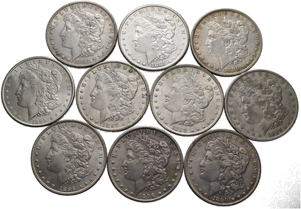 Lot 10 stk. 1 dollar Morgan type; 1880, 1881 S, 1884 S, 1886 O, 1888, 1889, 1890, 1896 (2) og 1897 O