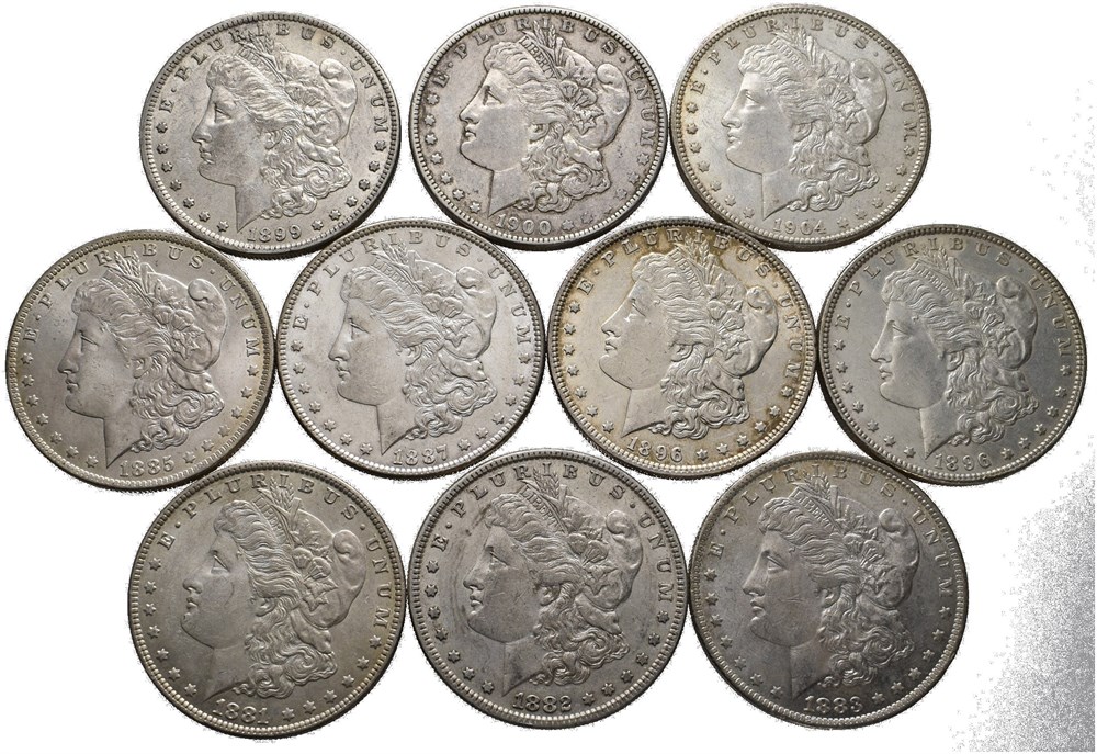 Lot 10 stk. 1 dollar Morgan type; 1881 O, 1882, 1883 O, 1885 O, 1887, 1896 (2), 1899 O, 1900 O og 1904 O