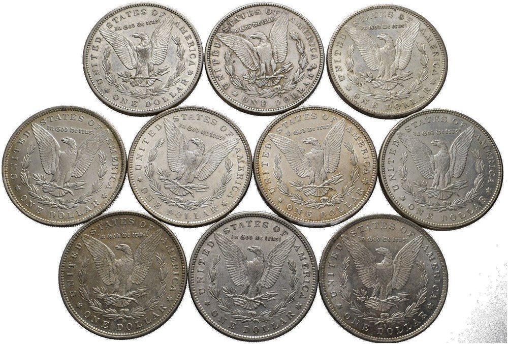 - Lot 10 stk. 1 dollar Morgan type; 1881 O, 1882, 1883 O, 1885 O, 1887, 1896 (2), 1899 O, 1900 O og 1904 O (15013327)