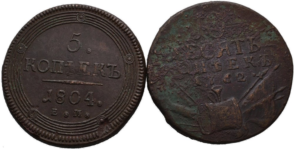Lot 2 stk. Peter III, 10 kopek 1762 og Alexander I, 5 kopek 1804 EM