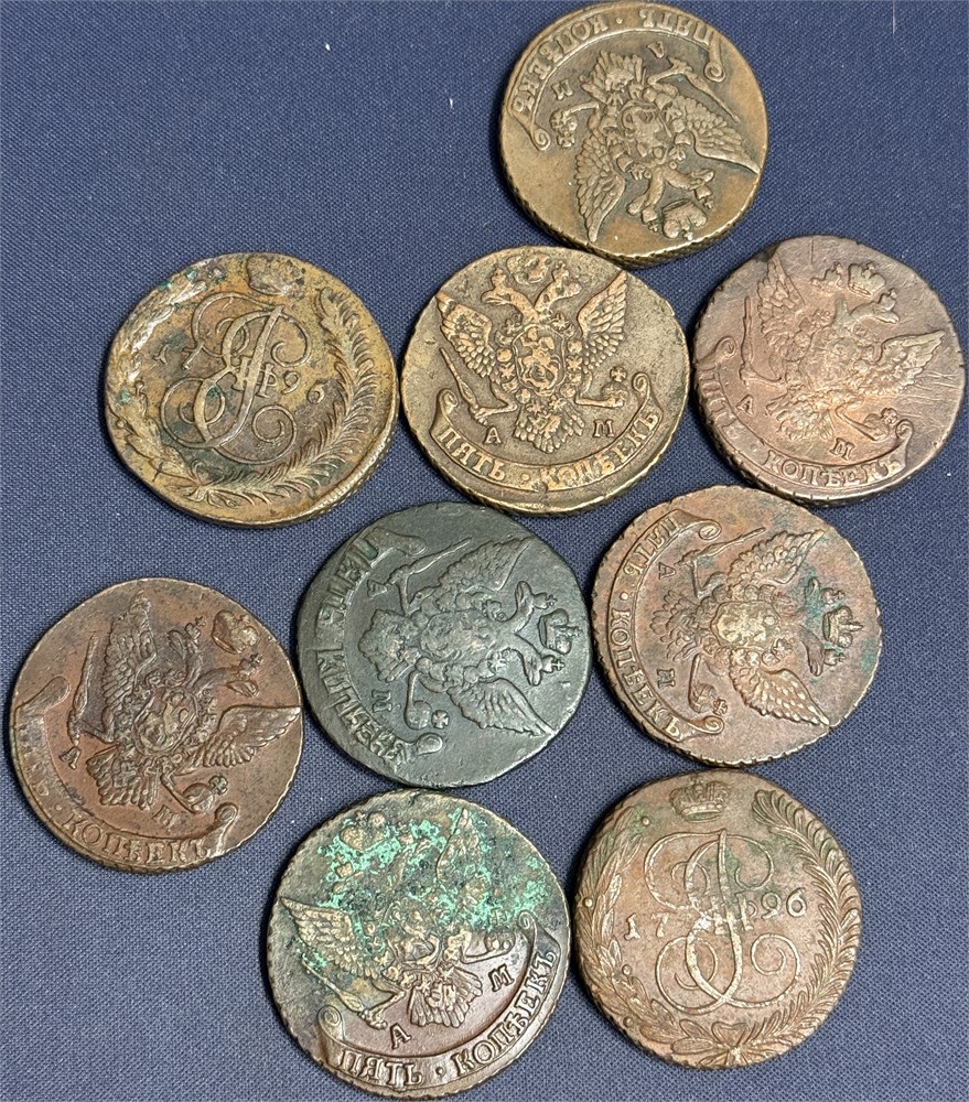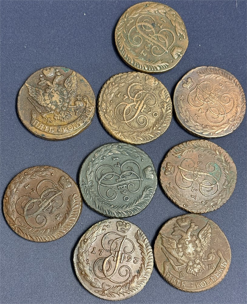 - Catharina II, lot 9 stk. 5 kopek AM (Anninsk); 1789 (2), 1790 (2), 1792, 1793, 1794 og 1796 (2). De fleste 1+ (15014047)
