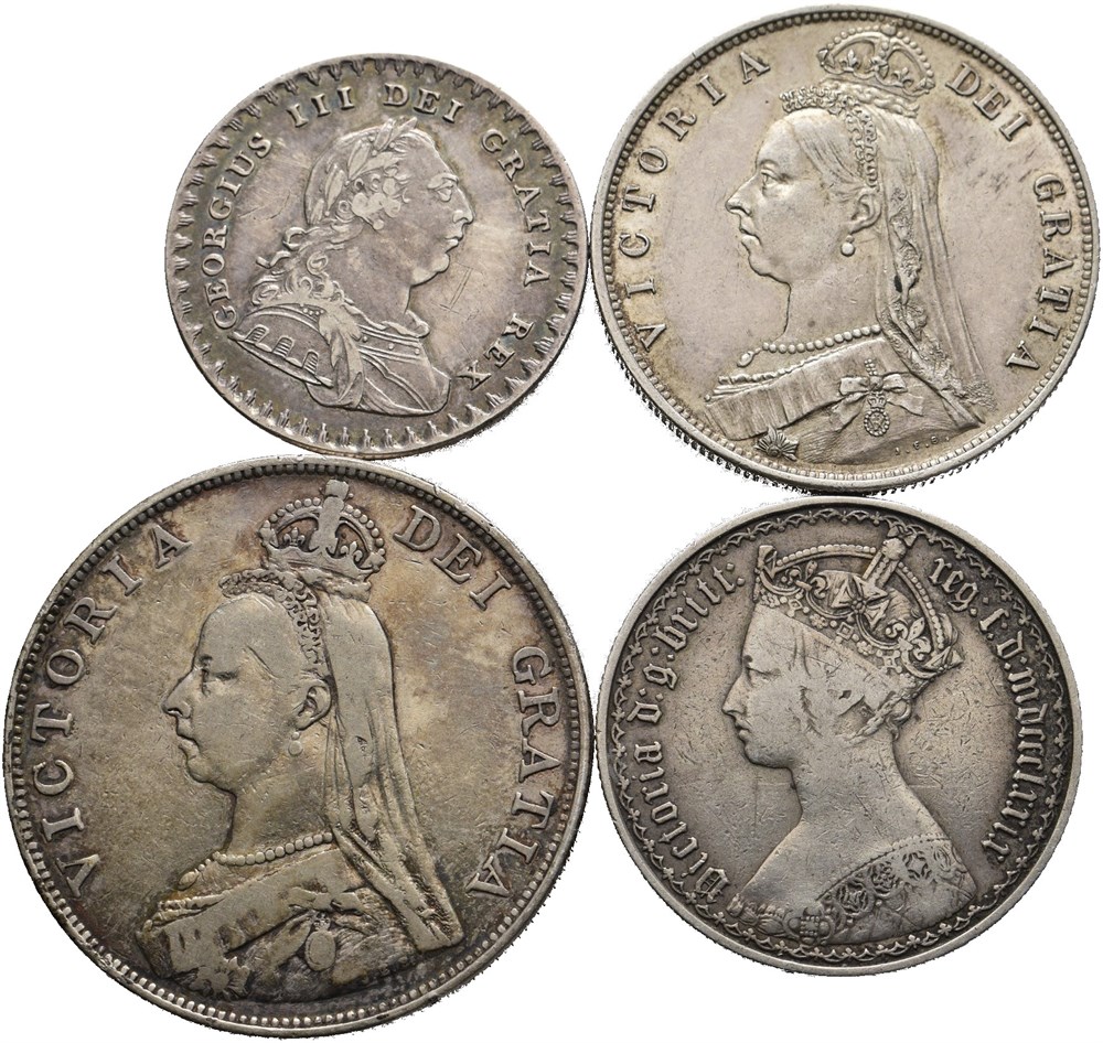 - England, George III, 18 pence bank token 1811 (riper), Victoria, dobbel florin 1889, halfcrown 1887, florin 1879 (15014804)