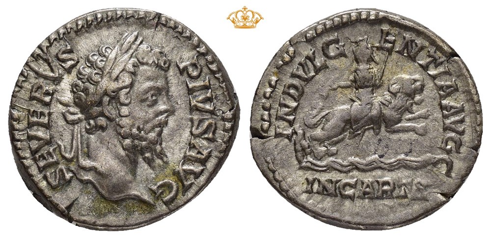 Septimus Severus 193-211 AD. AR Denarius struck circa 201-210 AD, Rome Mint, 3,43 grams, 18,5mm. Obverse: SEVERVS PIVS AVG, head of Septimus Severus, with laureate, facing right. Reverse: INDVLGENTIA AVGG IN CARTH, Dea Caelestis, riding an lion right, thunderbolt in right hand, scepter in left hand, water beneath flowing from rock left.