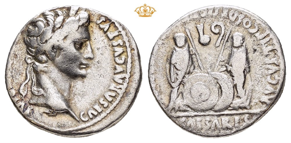 Augustus 27 BC - 14 AD. AR Denarius struck circa 2 BC - 4 AD, Lugdunum Mint, 3,64 grams, 18mm. Obverse: CAESAR AVGVSTVS [DIVI F PATER PATR]IAE, head of Augustus, with laureate, facing right. Reverse: C L CAESARES AVGVSTI F COS DESIG PRINC [IVVENT], Gaius and Lucius Caesar standing, facing, resting hand on shield, spear behind, simpulum right, lituus left.