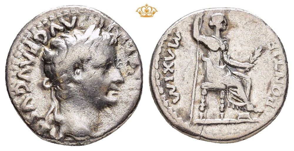 Tiberius 14-37 AD. AR Denarius struck circa 14-37 AD, Lugdunum, 3,57 grams, 18mm. Obverse: [TI CAESAR DIVI] AVG F AVGVSTVS, head of Tiberius, with laureate, facing right. Reverse: PONTIF MAXIM, female figure seated, facing right, holding branch in left hand, and long scepter in right hand.