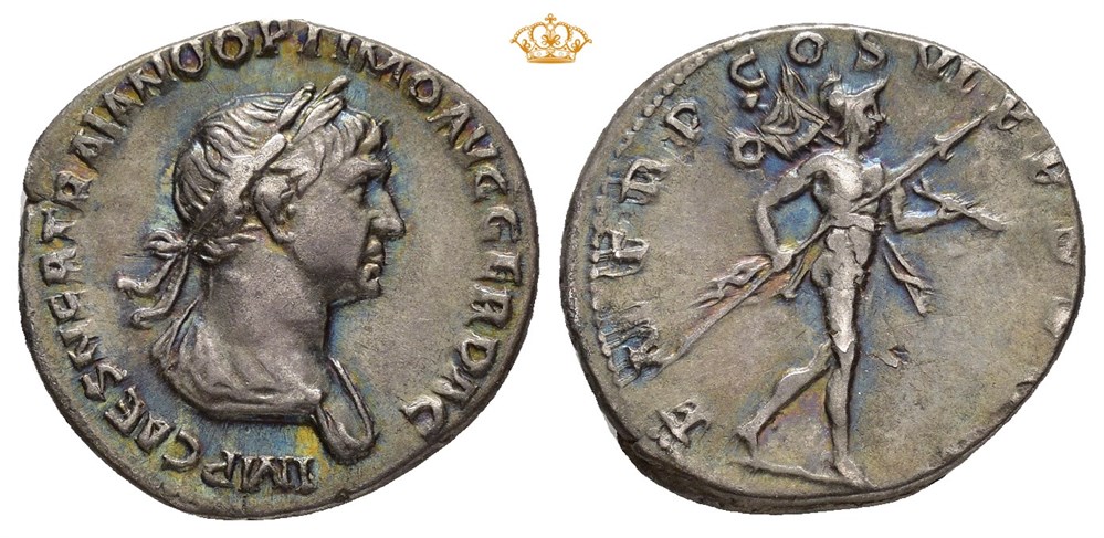 Trajan 98-117 AD. AR Denarius struck circa 114-117 AD, Rome Mint, 3,32 grams, 18mm. Beautiful iridescent tone. Obverse: IMP CAES NER TRAIANO OPTIMO AVG GER DAC, bust of Trajan, draped, with laureate, facing right. Reverse: P M TR P COS VI P P S (P Q R), Mars advancing right, holding spear in right hand, and trophy in left arm.