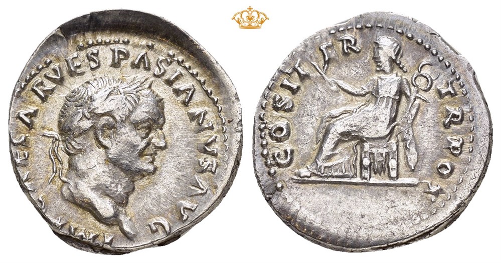 Vespasian 69-79 AD. AR Denarius struck 70 AD, Rome Mint, 3,51 grams, 19mm. Obverse: IMP CAESAR VESPASIANVS AVG, head of Vespasian, with laureate, facing right. Reverse: COS ITER TR POT, Pax seated left, holding branch in right hand, and caduceus in left arm.