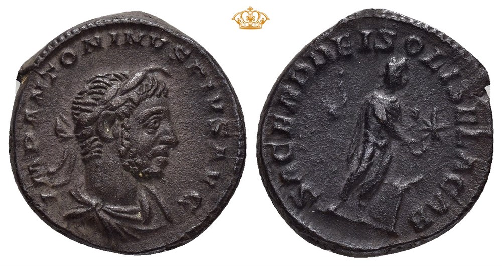 Elagabalus 218-222 AD. AR Denarius struck circa 218-222 AD, Rome Mint, 3,74 grams, 18,5mm. Dark patina. Obverse: IMP ANTONINVS PIVS AVG, bust of Elagabalus, draped, with laureate, facing right. Reverse: SACERD DEI SOLIS ELAGAB, Elagabalus standing, facing right, sacrificing over flamed altar, holding patera in right hand, club in left arm, star right in field.
