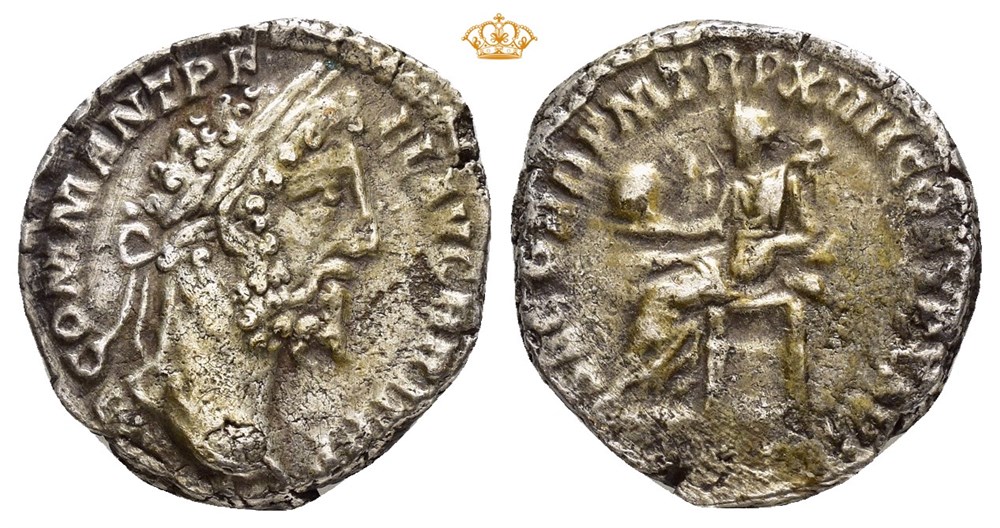 Commodus 177-192 AD. AR Denarius struck circa 189 AD, Rome Mint, 2,65 grams, 18mm. Obverse: M COMM ANT P FEL AVG BRIT P P, head of Commodus, with laureate, facing right. Reverse: SEC ORB P M TR P XIIII CO[S V DES VI], Securitas, seated left, holding globe in right hand, left arm resting on throne. Ex. Oslo Myntgalleri 13, lot 837, 25.11.2017.