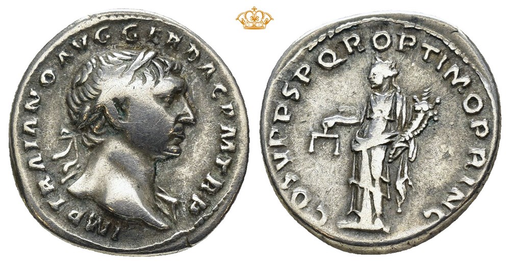 Trajan 98-117 AD. AR Denarius struck circa 103-111 AD, Rome Mint, 3,10 grams, 18mm. Obverse: IMP TRAIANO AVG GER DAC P M TR P, head of Trajan, with laureate, facing right. Reverse: COS V P P S P Q R OPTIMO PRINC, Aequitas standing, facing left, holding scale in right hand, and cornucopiae with left arm.