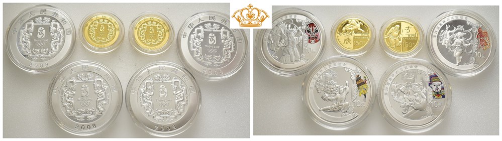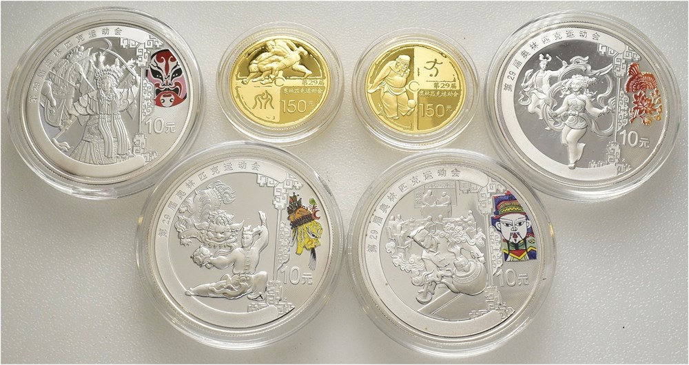 Beijing Olympics 2008, Proof set. Two gold coins and four silver coins. 150 Yuan 2008 "Soccer", 150 Yuan 2008 "Wrestling", 10 Yuan 2008 "Bowl Tea", 10 Yuan 2008 "Lion Dance", 10 Yuan 2008 "Yangge Dance" and 10 Yuan 2008 "Beijing Opera". Include original case of issue, with certificate for each coin.