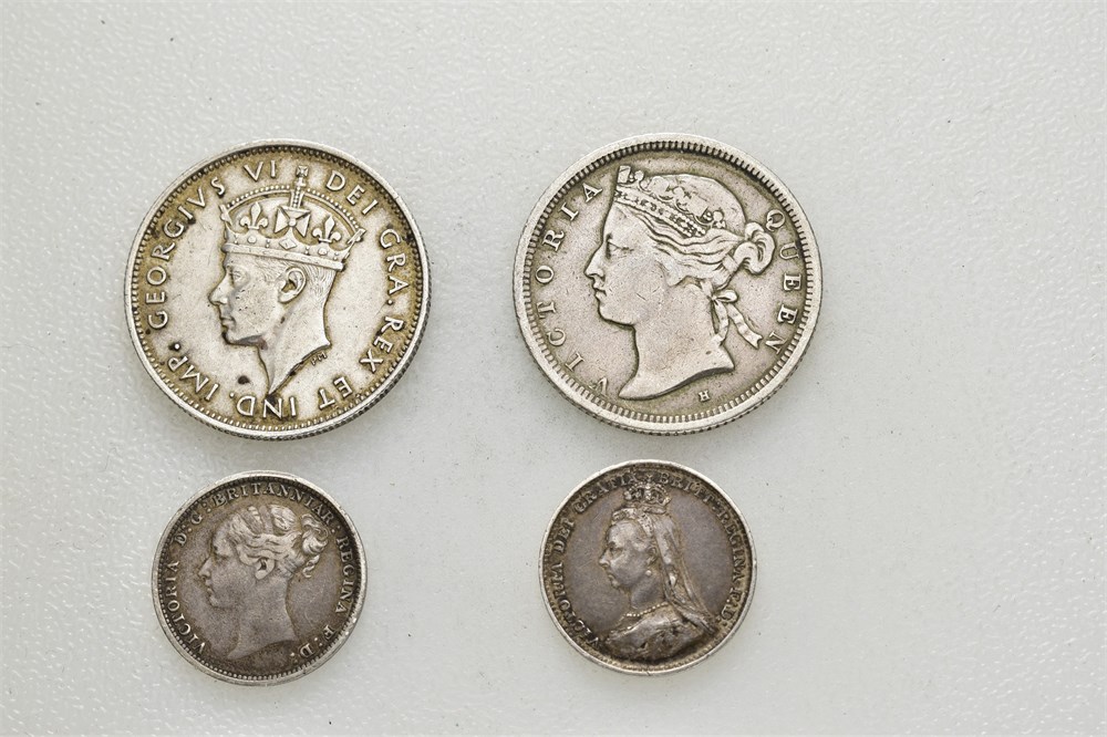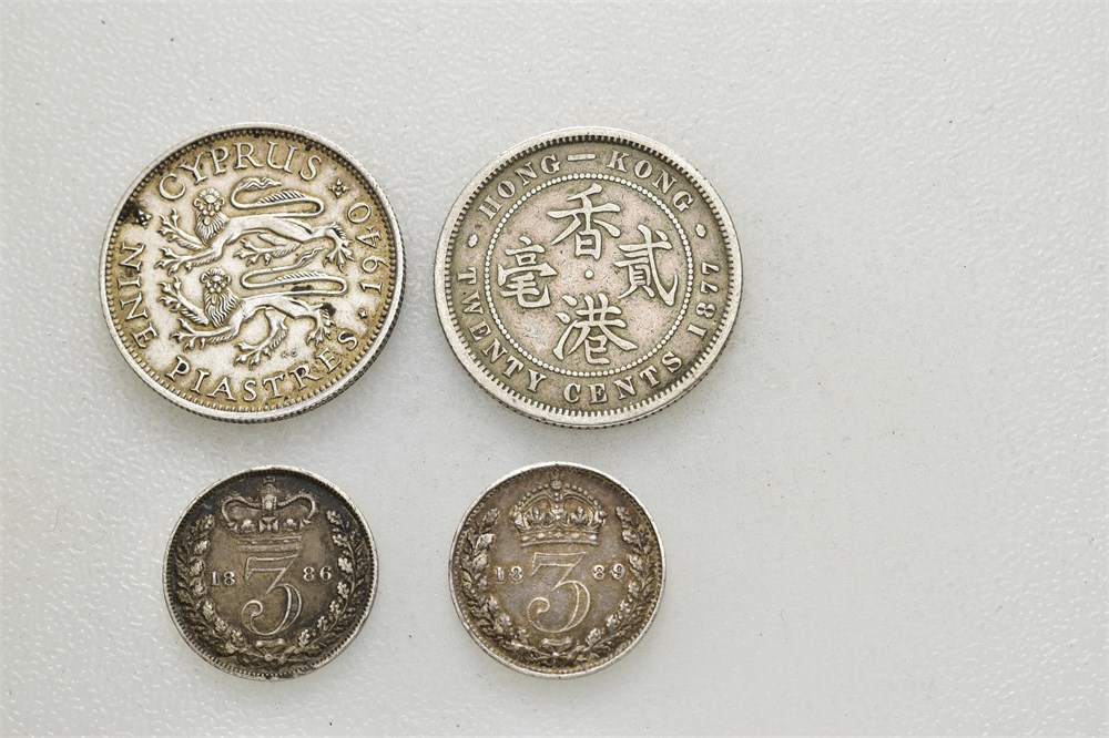 Lot. Hong Kong 20 cents 1877. Cyprus 9 piastres 1940. Great Britain 3 pence 1886 & 1889. Various condition.