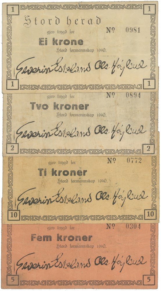Stord Herad. 1, 2, 5 og 10 kroner 1940.