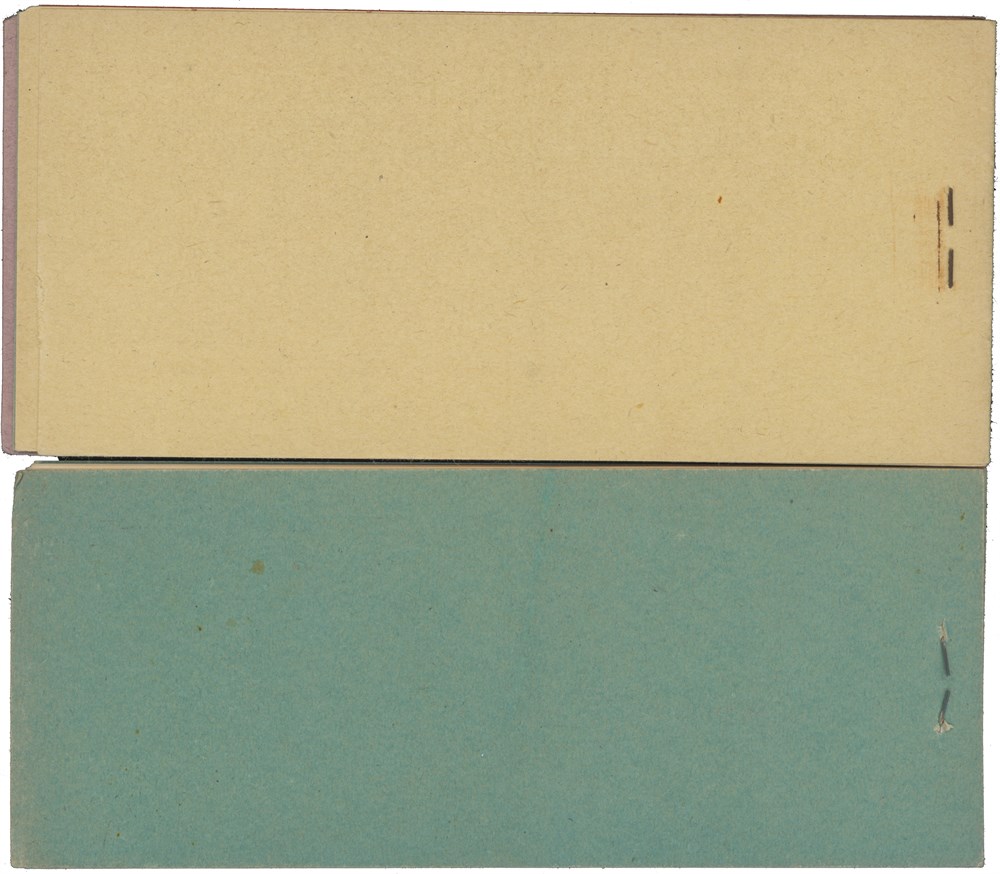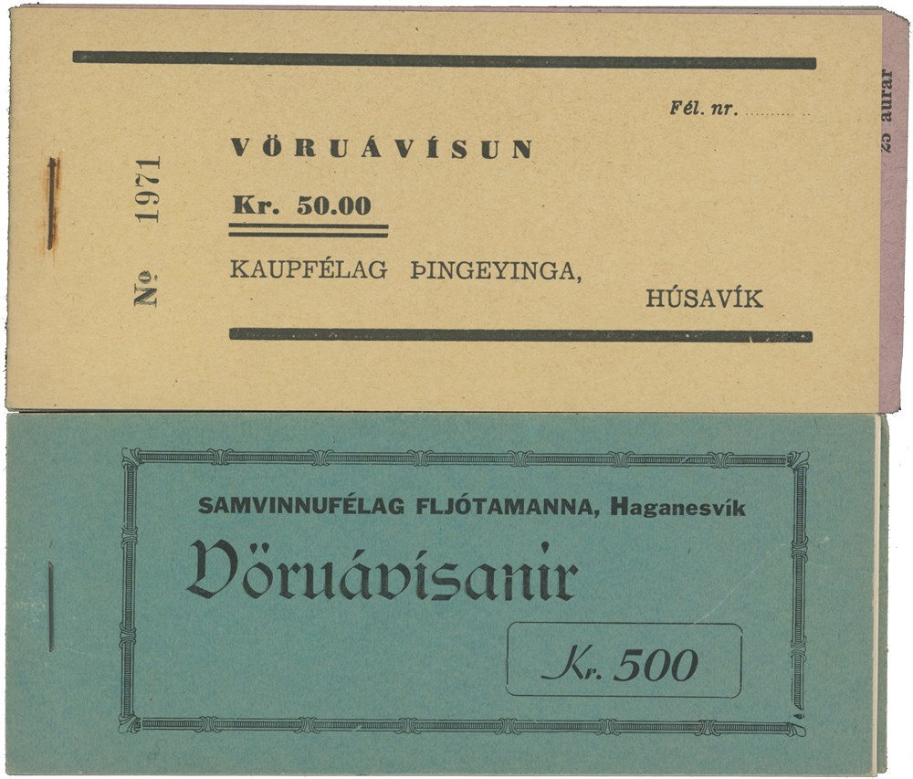 Lot 2 complete booklets with private currency from the Cooperative Society in Húsavík (kr 50) and Haganesvik (kr 500).