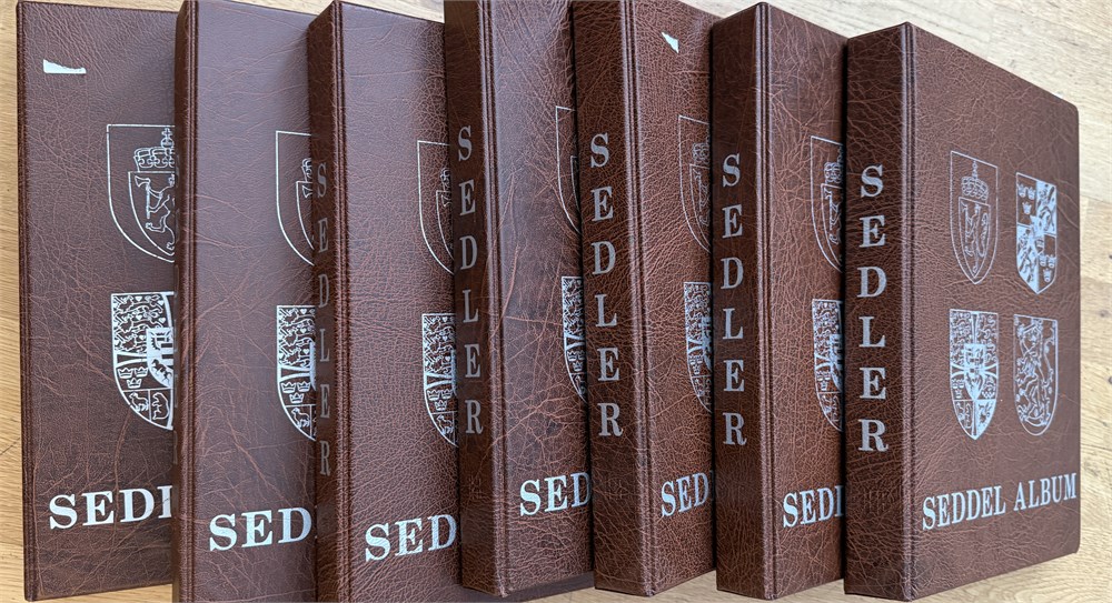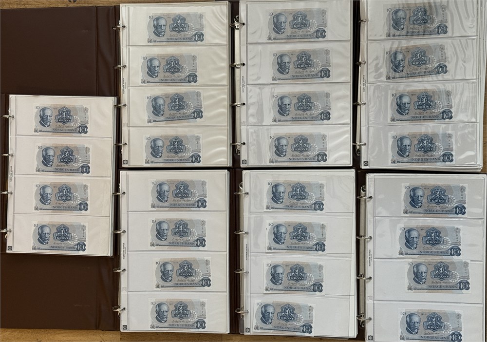 10 kroner 5. utgave, komplett fra 1973-1984 med erstatningssedler, i 7 album, det aller meste i kvalitet 0, katalogverdi over 200.000,-, mange gode kvaliteter på erstatningssedlene. Se vedlagt PDF. OBS!1972 Q er ikke med i disse albumene! Det er årstallene 1973-1984 komplett i disse.