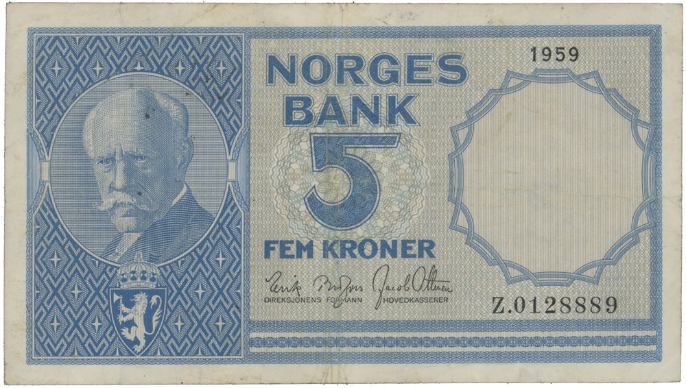 5 kroner 1959. Z.0128889. Erstatningsseddel/replacement note (0-million), sjelden/rare.