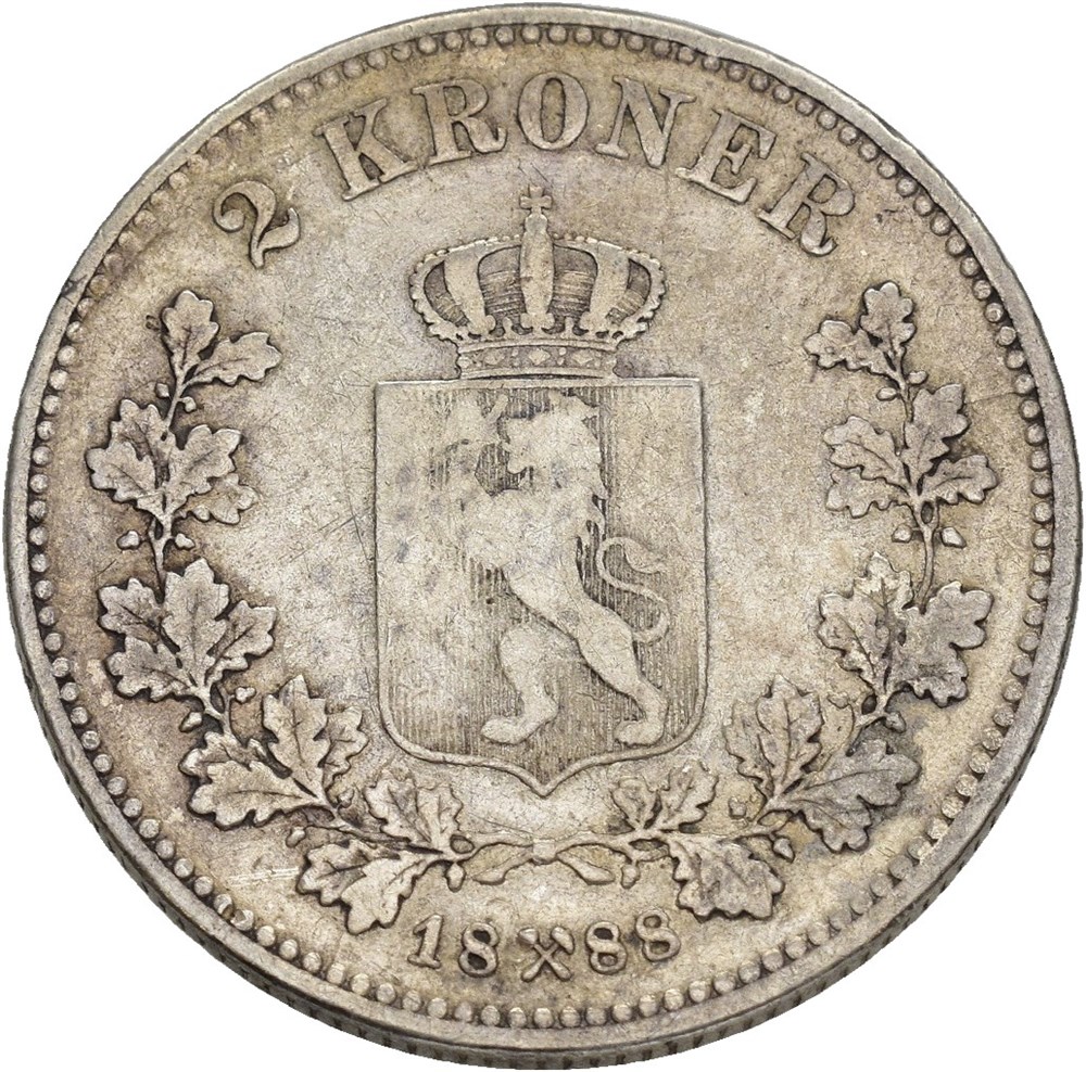 2 kroner 1888. Liten kantskade/minor edge nick. Liten ripe/minor scratch