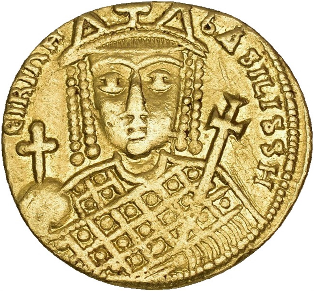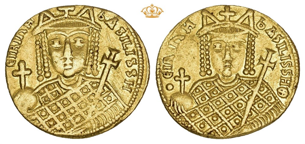 Irene 797-802 AD. AV Solidus (19.5 mm; 4.41 g). Constantinople mint. Obverse: ЄIRIҺH ЬASILISSH, Crowned bust of Irene facing, wearing loros, holding globus cruciger and cruciform scepter. Reverse:・ЄIPIҺH ЬASILISSH ⴲ, Crowned bust of Irene facing, wearing loros, holding globus cruciger and cruciform scepter. Well struck and attractive.